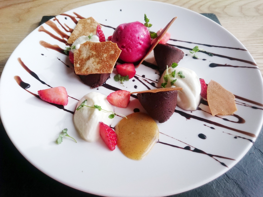 A bitter chocolate panna cotta, salted chocolate sauce, vanilla puree, baked white chocolate, white chocolate foam and goose berry sorbet. Made with Rowlstone Farm Herefordshire ice cream and sorbets.